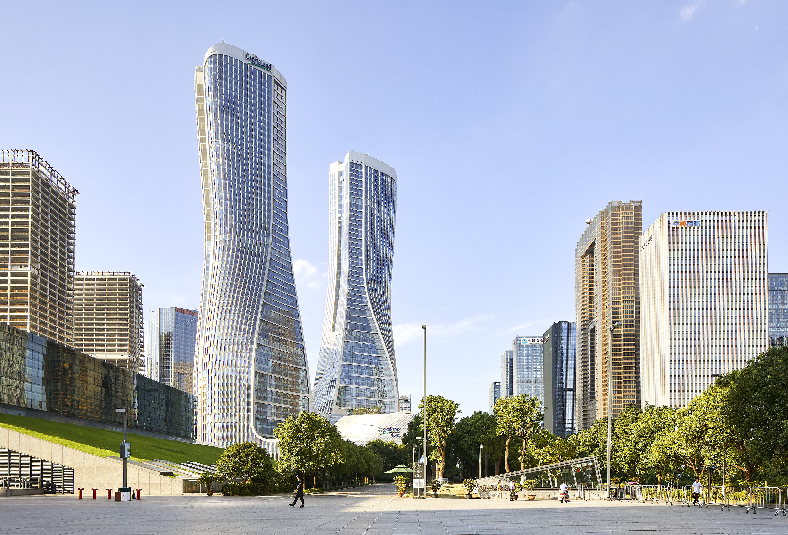 杭州来福士中心位于钱江新城CBD的核心区,项目占地40,355平方米,总建筑面积约385,335平方米,两座250米高的双子塔楼旋转而上,融合了国际甲级办公楼、购物中心、希尔顿康莱德酒店、雅诗阁服务公寓、珍藏单位(天御)、精品公寓(天璟)六大高端业态,是全球已开业来福士中规模最大、业态最丰富的一座,也是钱江新城CBD的耀眼地标。
