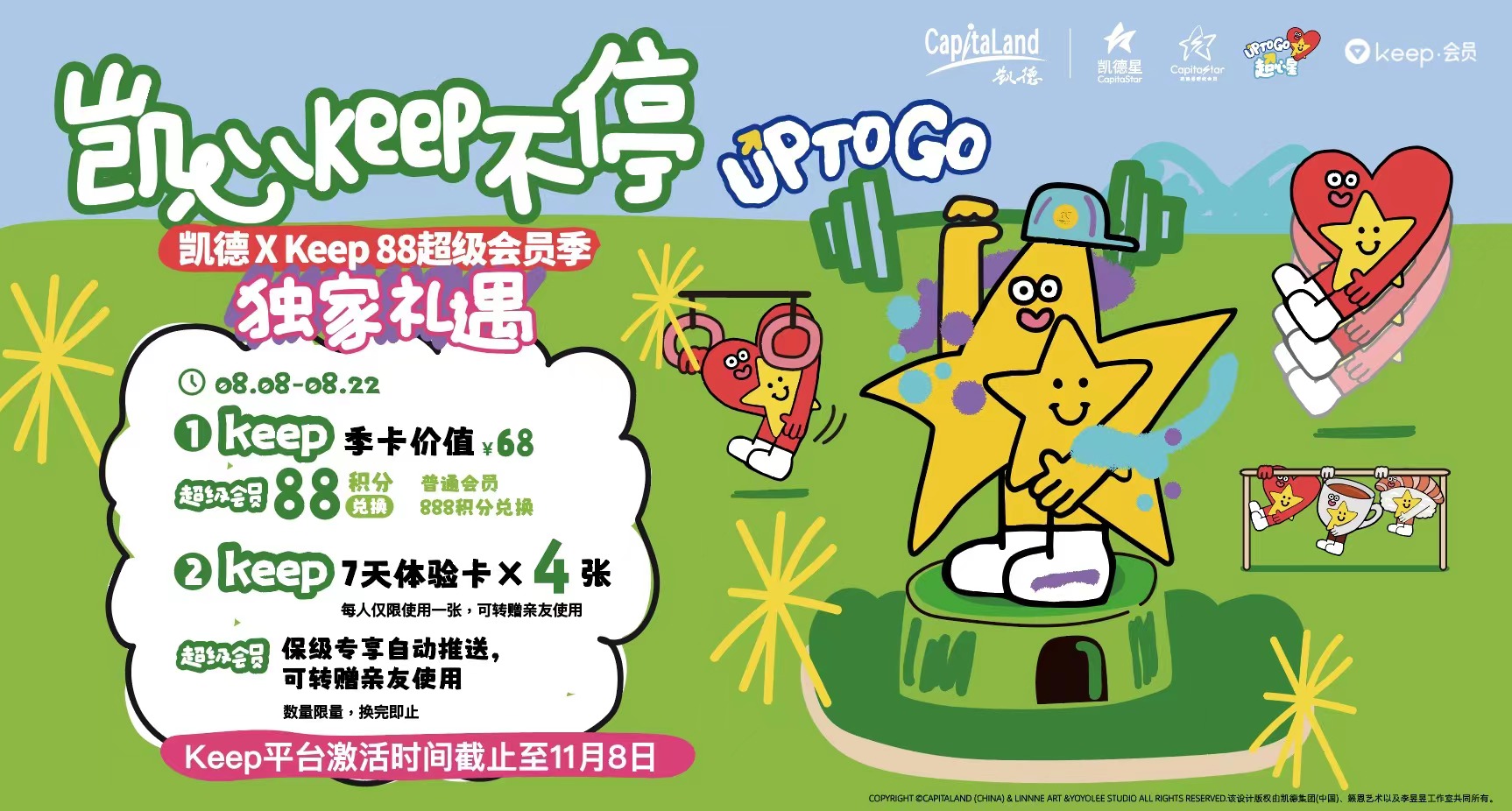 联合运动健身App——Keep,凯德推出会员限时礼遇。凯德星超级会员凭88积分、普通会员888积分,即可兑换价值68元的限量款Keep会员季卡(兑换有效期至11月8日);超级会员于活动期间保级成功,更可获得4张Keep会员7天体验卡,超级会员可使用一张,其余体验卡可以一键分享转赠亲友使用,一起凯心Keep不停。