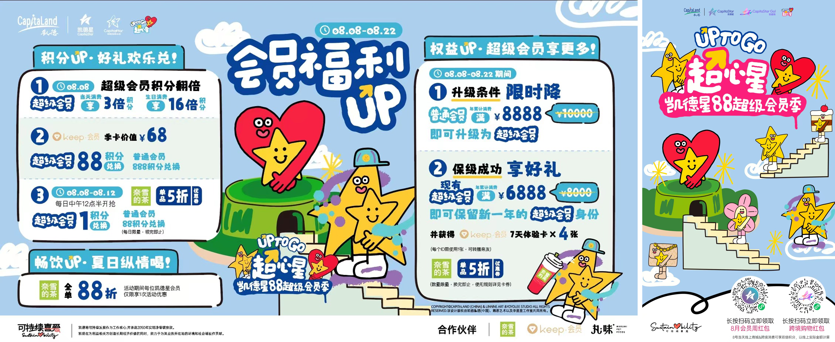 8月8日,2023凯德星88超级会员季在全国正式开启。作为凯德一年一度的宠粉节日,今年的活动以“UP TO GO”为主题,象征会员权益的全面升级。8月8日至 8月22日期间,凯德联动奈雪的茶、Keep、丸味等多家品牌合作伙伴,在全国19座城市的40余家凯德购物中心,推出力度空前的会员权益与一系列精彩纷呈的线下活动,为会员带来狂欢盛宴。