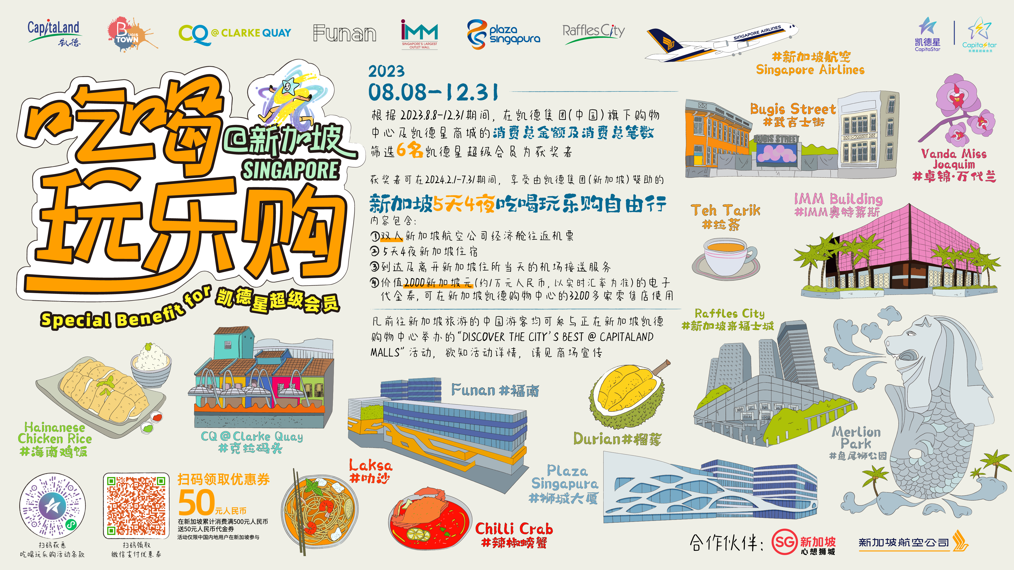此外,即日起至12月31日期间,凯德星超级会员更可参与“吃喝玩乐购@新加坡活动”。依据在全国凯德购物中心及线上凯德星商城的消费总金额与消费总笔数,凯德将筛选出6位超级会员,即有机会获得专属福利大奖——包括:每人2张新加坡往返机票、新加坡酒店5天4晚住宿(可住2人)、到达及离开新加坡住所当天的机场接送服务、以及价值2,000新币(约合1万元人民币,以实时汇率为准)的电子代金券,可在新加坡凯德购物中心的3200家零售门店使用。获奖者可在2024年2月1日至7月31日期间前往新加坡。