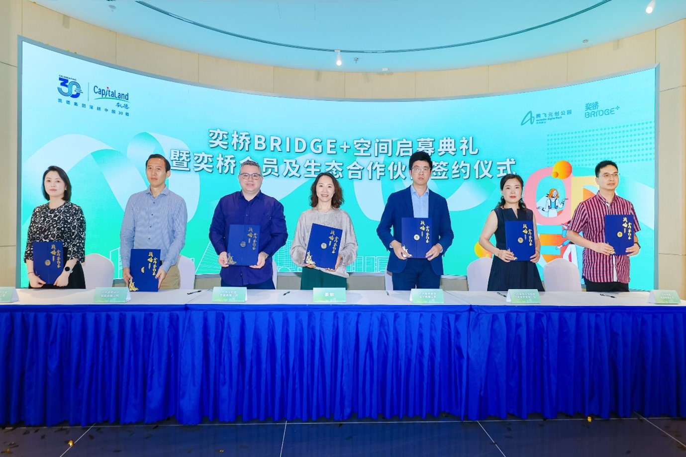 (从左到右)凯德地产(中国),东及西区,项目开发和设计管理,总经理 杨晓峰、凯德投资(中国),苏州产业园区,总经理 邵凯勇、苏州高新区产招中心总经理 朱惠芳、凯德地产(中国)董事总经理(东、西及北区) 李香莹、苏州高新区党工委委员、管委会副主任 虞美华、凯德投资(中国),高级执行董事 陈永明、苏州高新区狮山商务创新区党委副书记 高蔚、三菱地所(上海)投资咨询有限公司,产业商业事业部,总监 平井夕也、凯德地产(中国),腾飞苏州狮山元创公园,总经理 薄根荷