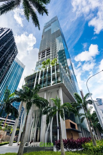CapitaGreen是一座40层高的甲级办公楼,获得新加坡建设局颁发的绿色建筑标志铂金奖和通用设计标志铂金奖,大厦顶部的花瓣状结构可以吸入冷空气,降低空气处理机组的负荷。