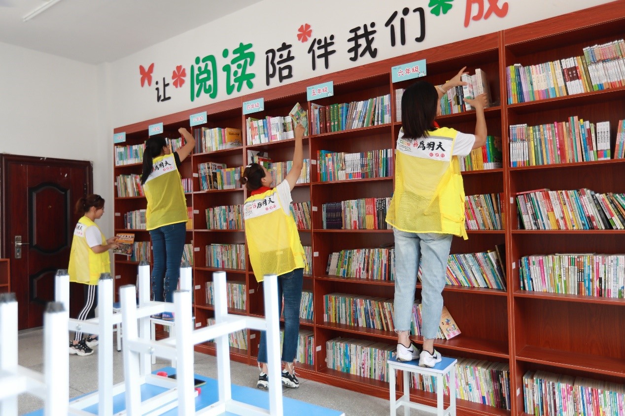 (图为:志愿者整理图书阅览室)