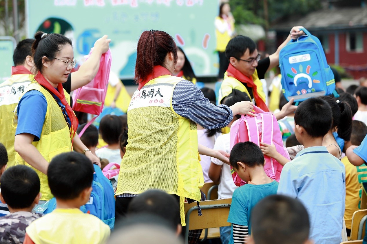 (图为:捐赠仪式上志愿者捐书包给孩子们,孩子们收到书包开心的微笑)
