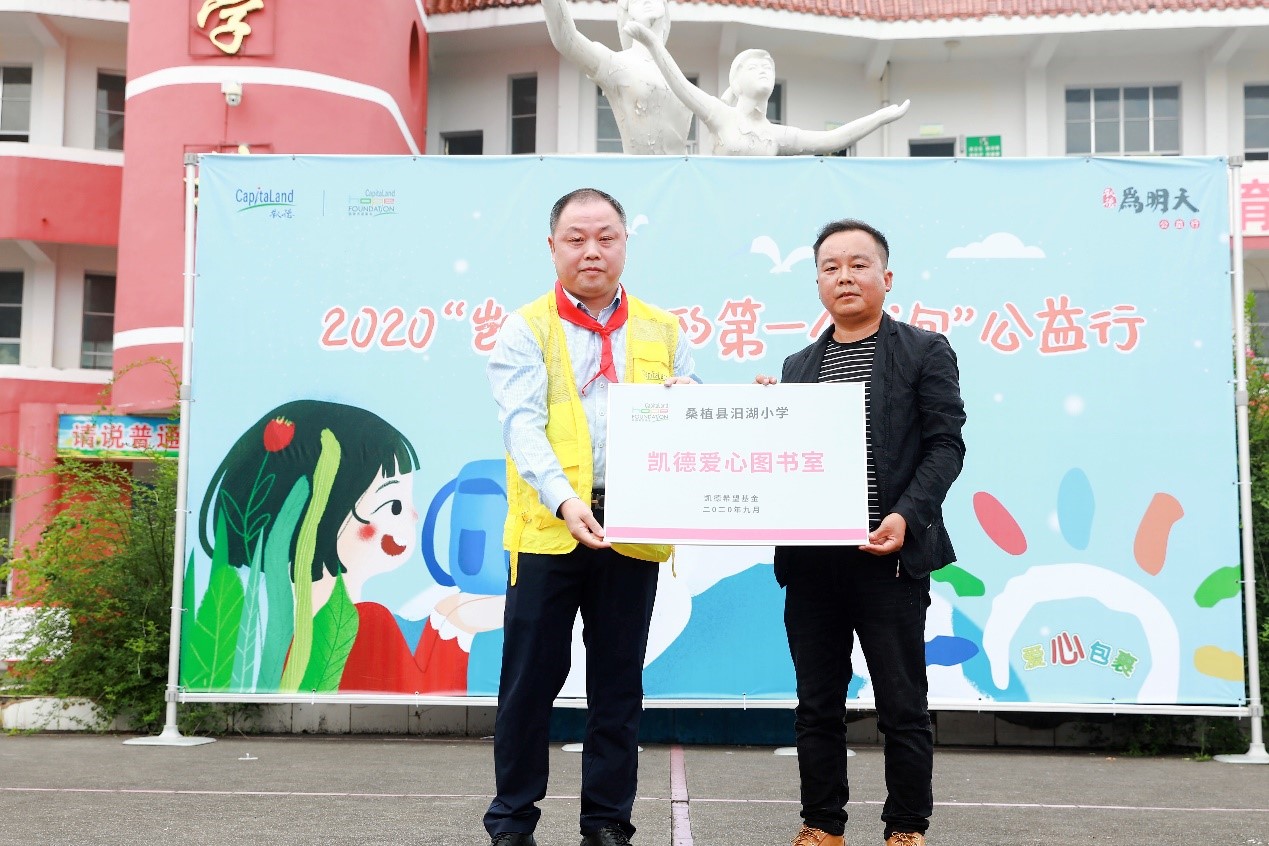 (图为:凯德集团(中国)商业管理长沙城市总经理蔡乐胜先生捐赠凯德爱心图书室牌匾给张家界桑植县汨湖小学满校长)