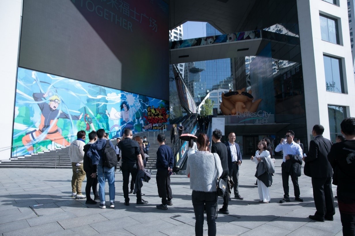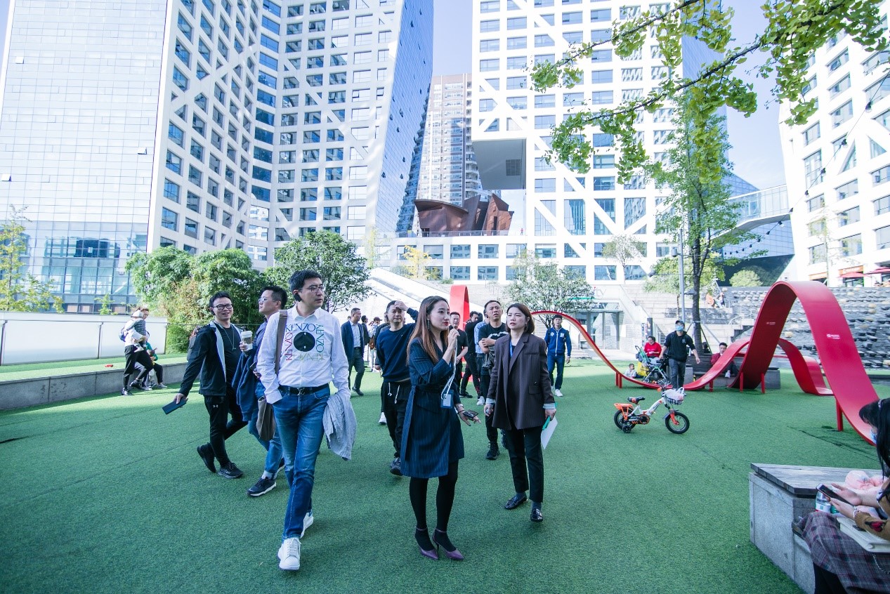 随后大部队来到来福士“共享空间”水景平台,负责人向大伙展示了今年疫情后,项目以“共生”为主题原创打造的艺术装置,流动的红丝带代表与大众、与合作伙伴“共生、向上”的态度。