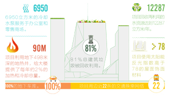 成都地热资源丰富,距离来福士广场所在地表位置一两百米深处的地层拥有恒定温度18℃,该建筑利用地下90米深的地热井,冬季地源把热量从地下土壤中转移到建筑物内,夏季再把地下的冷量转移到建筑物内的地源热泵系统。不同于传统的锅炉和供热系统,2*640kW地源热泵系统纳入到系统中,给大楼提供了每年约2%的采暖和供冷总量。通常情况下,租户区根据计量表便可随时了解和调整各自的能源使用。综合这些方法,相较LEED基准建筑,成都来福士广场每年可节约6百万千瓦时用电量。