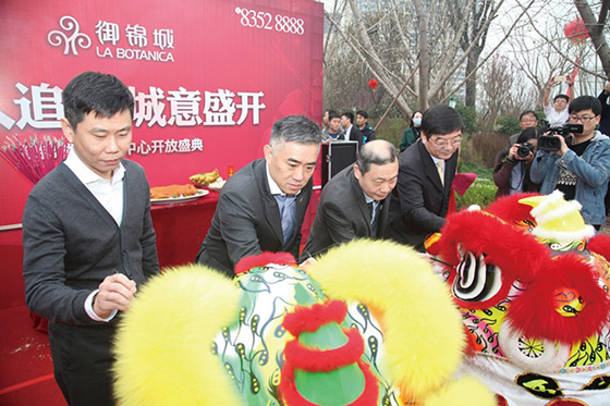 盛典当日,营销中心外彩旗高扬、热闹非凡。御锦城领导发表活动致辞后,在一阵响彻云霄的鞭炮声中,御锦城营销中心在万众瞩目中盛大开放!众领导高香祭拜为业主祈福,随后“金狮送福,祥鼓纳吉”的舞狮表演,更是把盛典推入了高潮。最后在鞭炮和掌声齐鸣中,领导们上台剪彩,为御锦城开启了新篇章。