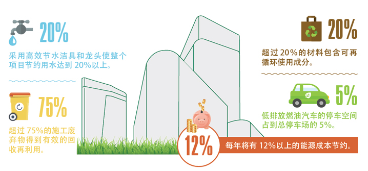 通过使用高效用水装置,冷凝水和雨水回收系统的使 用,帮助项目金奖部分达到节水40%以上,银奖部分达到 节水30%以上;采用高效节水洁具和龙头使整个项目节约 用水达到20%以上。超过75%的施工废弃物得到有效的 回收再利用,超过20%的材料包含可再循环使用成分(项 目材料总价),超过20%的材料符合本地采购(半径800公里范围内原材料采集加工生产)。
