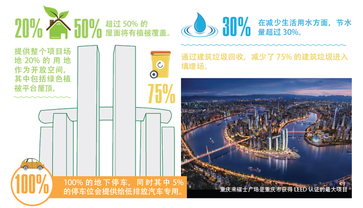重庆来福士广场坐落在城市的核心地带——朝天门, 面朝长江和嘉陵江的交汇处。整个项目由国际知名建筑大 师摩西•萨夫迪 (Moshe Safdie) 担纲设计,建成后,将涵 盖顶级豪宅、购物中心、国际甲级写字楼、五星级酒店和 国际高端服务式公寓,以及城市水陆立体交通枢纽等。项 目预计2018年分阶段开业。重庆来福士广场的裙楼、观 景天桥、T4N及T4S塔楼在2014年获得LEED建筑主体 和外壳金级预认证 ,是重庆市获得此认证的最大项目,也 是中国第三个获得此认证的综合开发项目。