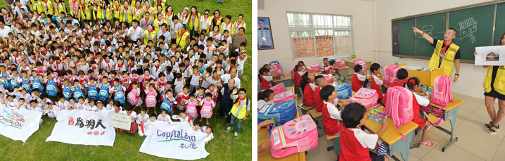 9月8日——9月9日,有风、有雨、有太阳。来自广州、 深圳、佛山、东莞、茂名、泉州和香港等地的50名“为明天” 志愿者,带着“凯德•我的第一个书包”走进了茂名市田 头埇凯德希望小学,向这所小学的45名一年级小学生捐 赠了新书包、新衣服及文具。活动期间,志愿者还向学校 捐赠了一批全新的体育器材和书籍,开展了一系列校园美化工作,开设“小小建筑师”课程,组织“趣味运动会” 等活动,与孩子们共同度过了愉快且有意义的时光。