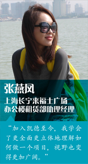 来到凯德2年多,张燕凤(如下简称“张”)一直在从事上海长宁来福士广场办公楼租赁工作。据她介绍,长宁来福士广场的办公楼一共有3栋,第一栋已几近满租,处于正常运营状态;第二栋最近新近交付,目前租赁情况良好;第三栋办公楼体量比较大,目前在做前期预租准备。“办公楼的逐步推出为整个项目奠定了良好的人气和基调,我相信随着整个项目包括商场的正式开张,长宁来福士广场肯定会是上海的新地标之一。”