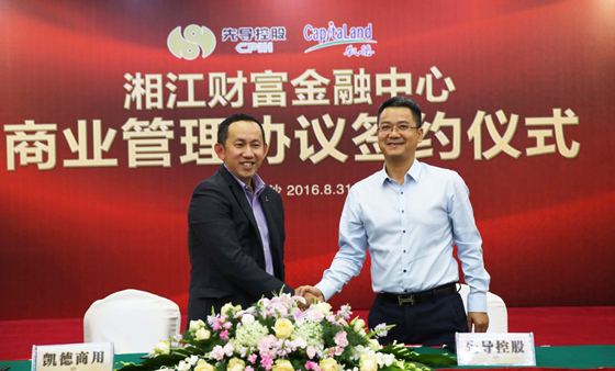 8月31日,凯德集团与长沙先导投资控股集团就长沙湘江财富金融中心项目签订了购物中心管理合同。凯德商用首席执行官廖茸桐、凯德商用东北区& 华中区域总经理袁嘉骅等领导出席签约仪式。长沙湘江财富金融中心位于滨江新城中央商务区核心中轴,是以现代金融商务功能为核心,以文化、休闲、旅游综合商圈为驱动引擎的城市副中心。长沙湘江财富金融中心是集办公、商业、购物、休闲娱乐于一体的地铁上盖630,000平方米地标综合体。其中购物中心部分建筑面积95,000平方米,定位为区域级商业中心,一期已于今年4月开工,预计2018年底开业。