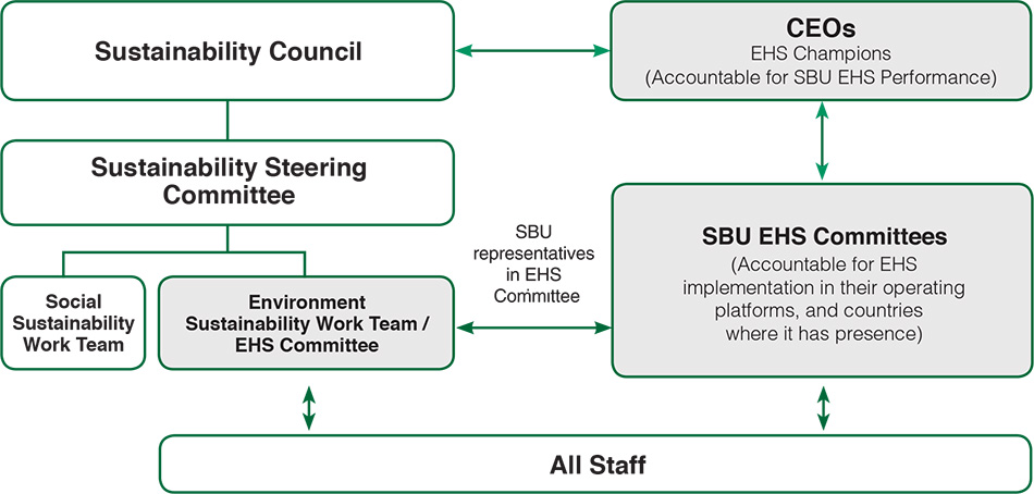 CapitaLand’s EHS Committee maintains the Group’s EHS Management System. Each Strategic Business Unit (SBU) also has its own EHS Committee to drive initiatives in countries where they operate with support from various departments. The CapitaLand EHS Committee doubles up as the CapitaLand Environment Sustainability Working Team and supports the work of CapitaLand’s Sustainability Steering Committee. Please refer to Introduction Chapter for details of the Sustainability Management Structure.