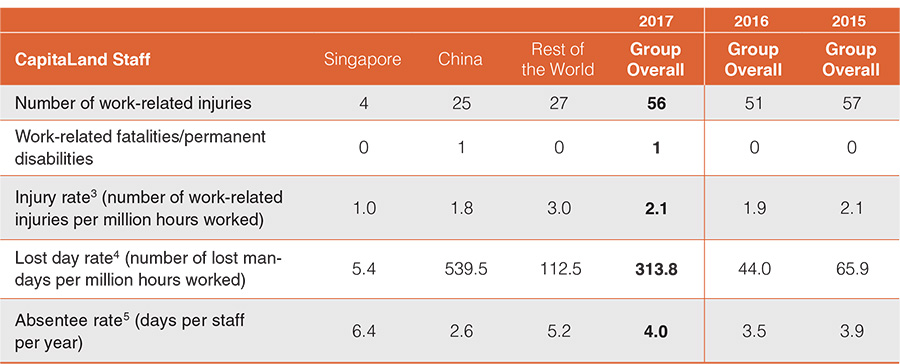 CapitaLand undertook various initiatives to improve the Accident Frequency Rate (AFR) and Accident Severity Rate (ASR)8 of its main contractors at its sites. In 2017, there were no injuries at its Singapore construction sites9.