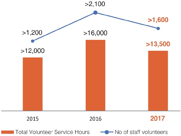 CapitaLand is a strong advocate of volunteerism and was one of the first companies to formalise three days of Volunteer Service Leave (VSL) for its staff. In 2017, over 1,600 staff in CapitaLand properties tapped on this VSL policy to volunteer more than 13,500 hours2 in various activities in Asia and beyond. CapitaLand encourages its staff to volunteer and over 125 staff dedicated more than 1,700 hours to volunteer during their personal time on CapitaLand initiatives. The estimated salary cost to CapitaLand in 2017 based on VSL taken was over S$210,000.