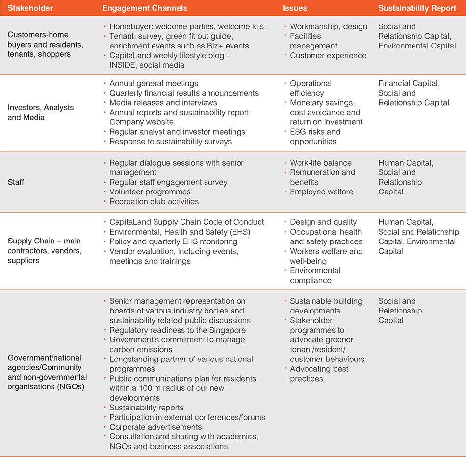 Through the various engagement channels, CapitaLand seeks to understand our stakeholders’ views, communicate effectively with them and respond to their concerns. Stakeholders’ issues of interest are outlined on the next page.
