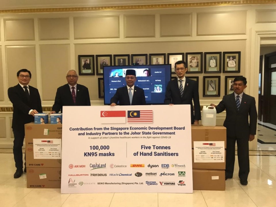 EDB及び19企業、ジョホール州政府にマスク10万枚、手指消毒液5トンを寄付