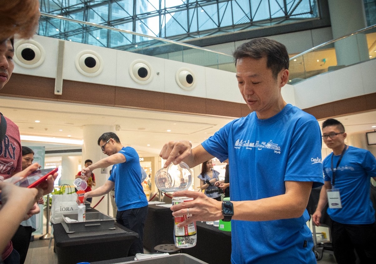 Mr Lee Chee Koon, CapitaLand Group Chief Executive Officer and Director of its philanthropic arm CapitaLand Hope Foundation, joining employees to distribute hand sanitisers to members of the public at Raffles City Singapore