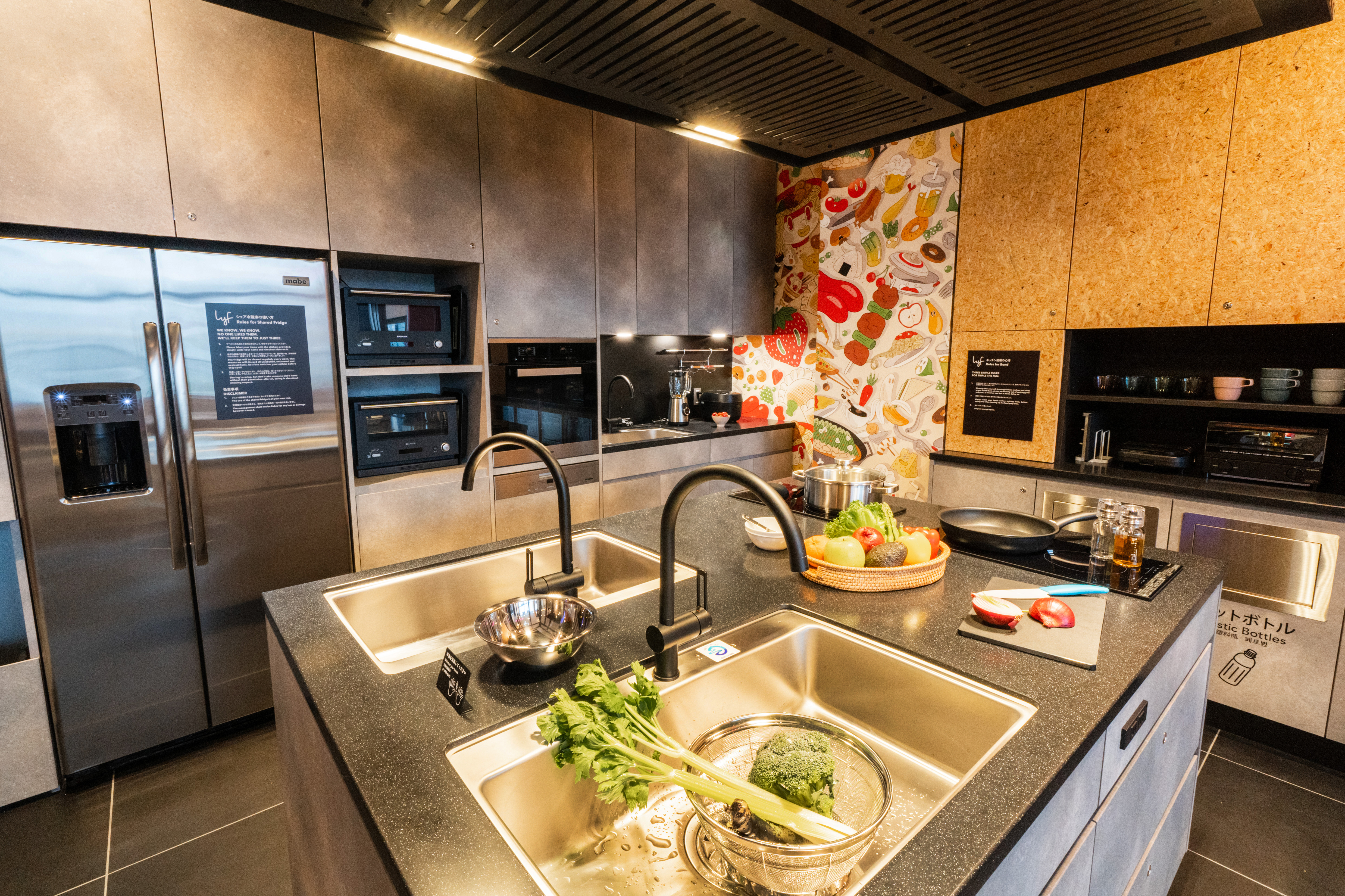 In lyf Tenjin Fukuoka’s social kitchen, there is a wall art featuring motifs of the local cuisine and produce of Fukuoka. This includes the motsunabe stew, the Amaou strawberry which is native to Fukuoka, popular food items like mentaiko and yakitori. It is illustrated by Marumiyan, a graphic artist based in Fukuoka who has worked with brands such as Adidas and Amorepacific.