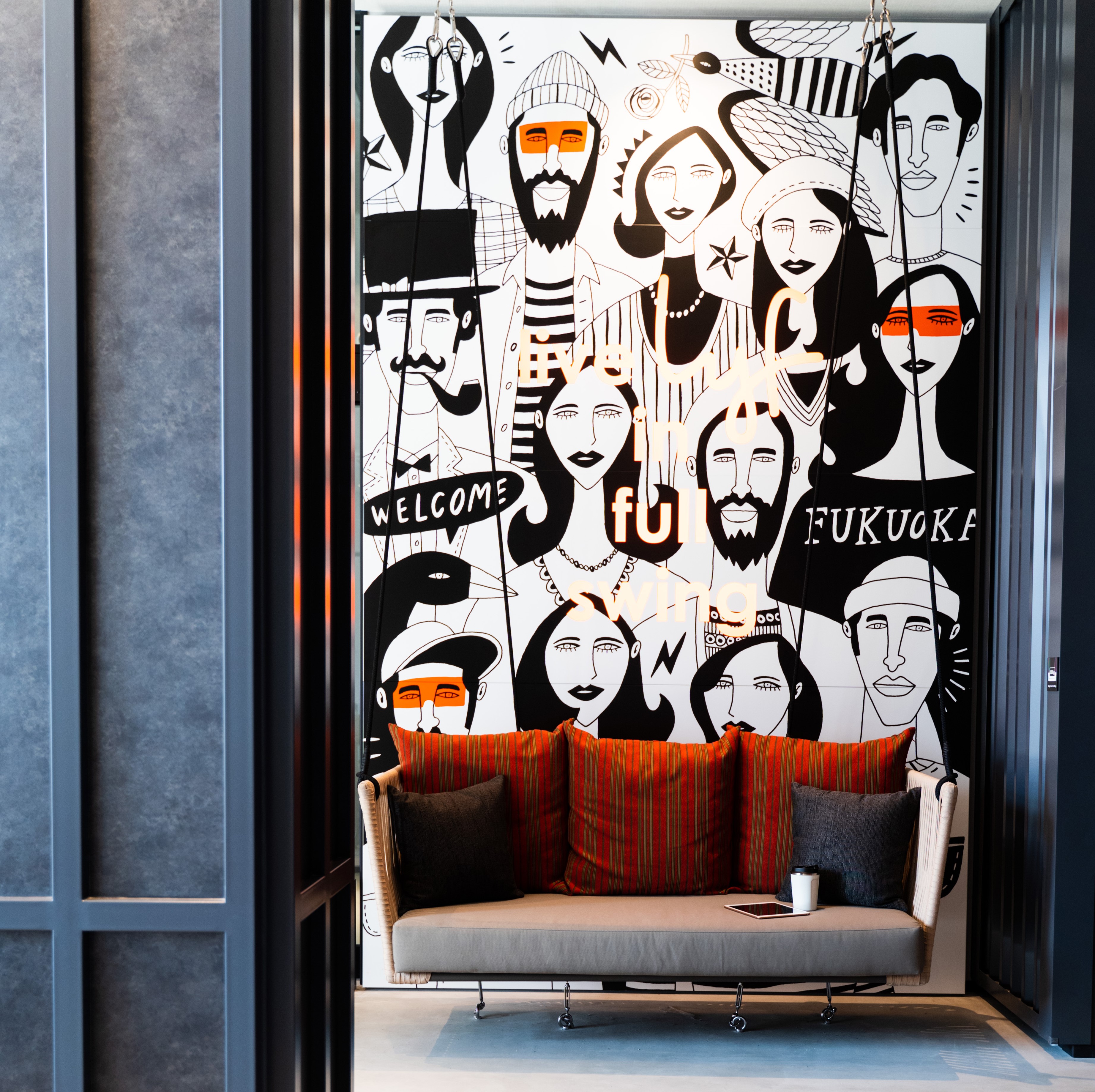 The lobby of lyf Tenjin Fukuoka features a wall art by local Fukuoka artist, Kazuhiko Ifuku.