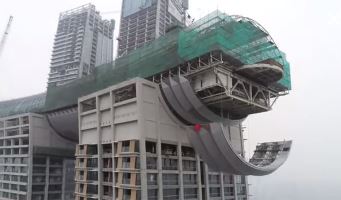 As Raffles City Chongqing’s crowning glory, The Crystal represents an engineering feat.  To erect efficiently, the steel structure was first divided into nine segments – four segments that were built in-situ above the four skyscrapers; three middle segments suspended between the four skyscrapers that were prefabricated on ground and hoisted into place by hydraulic strand jacks; and two cantilever segments that were assembled in short sections from the two ends of the rightmost and leftmost towers.  Hoisting the three middle steel segments of The Crystal – each weighing up to 1,100 tons – to the height of 250 metres marked a world first.