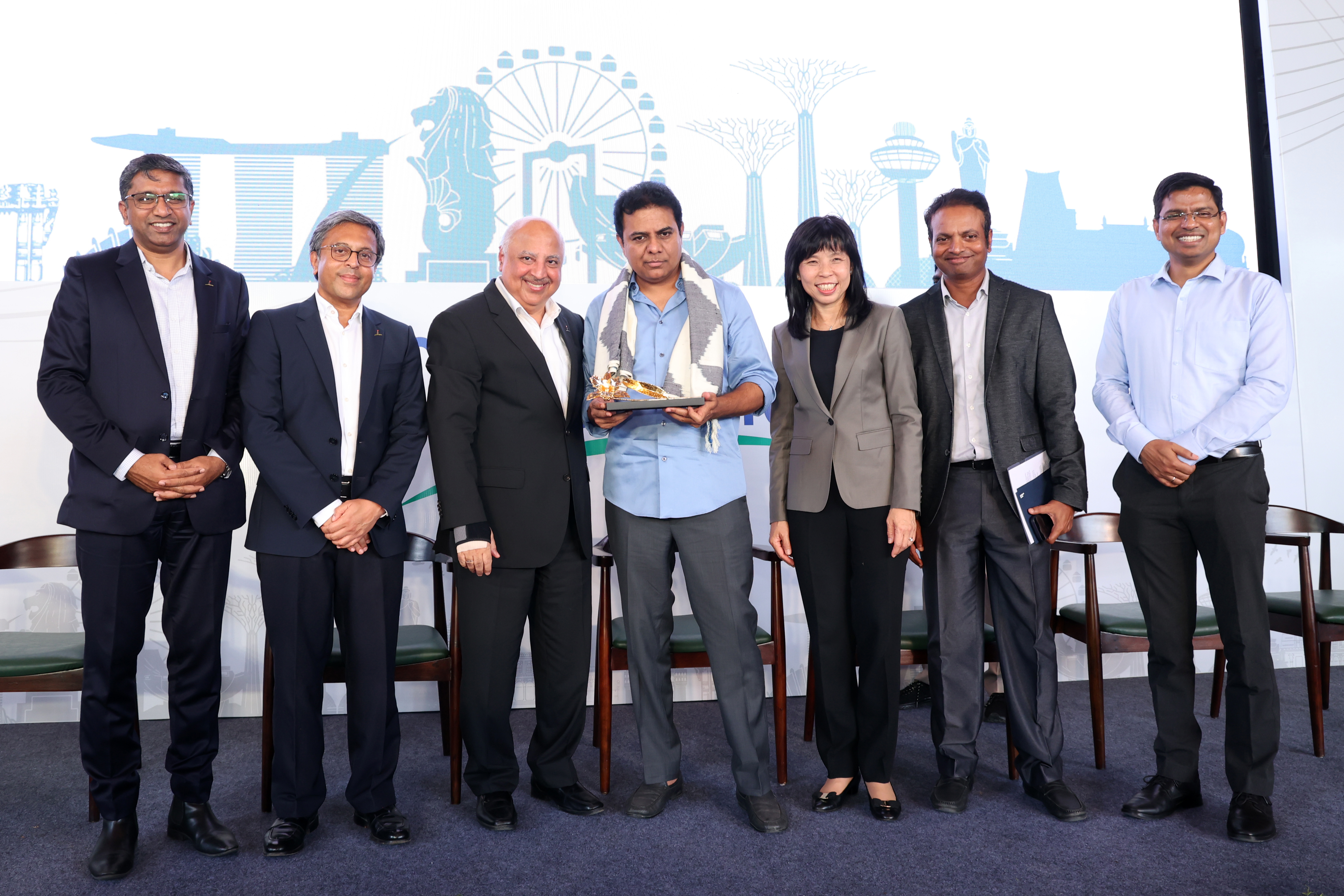 Shri K.T. Rama Rao (centre), Hon’ble Minister for Municipal Administration & Urban Development, Industry & Commerce, Information Technology, Electronics & Communication, Government of Telangana received a token of appreciation from Mr Manohar Khiatani (3rd from left), Senior Executive Director, CLI and Chairman of CLINT.