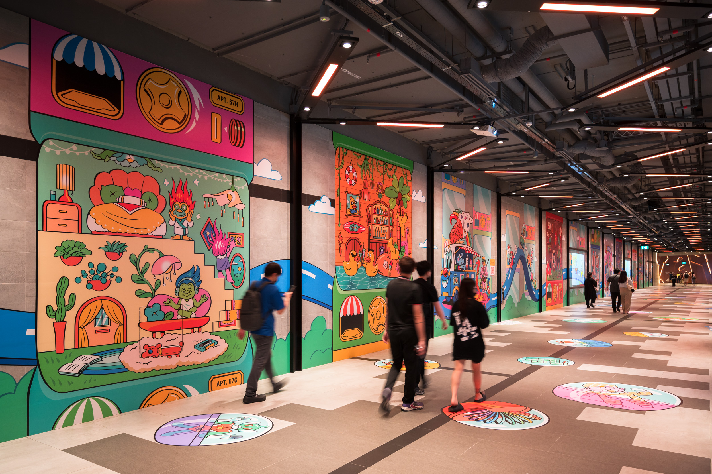 The partnership kicked-off with The Gachapartment Complex (2024) by Nikkei at Funan’s Underground Pedestrian Link during the Light to Night Festival 2024 in January. Local illustrator Nikkei conceptualised a clandestine sanctuary, where toys lived intricate lives that mirrored our own. Attendees of the festival witnessed these toys spring to life and delved into the parallels between their bustling lives and the vibrancy of Funan. This immersive experience was facilitated by an augmented reality (AR) component developed by students from Temasek Polytechnic.