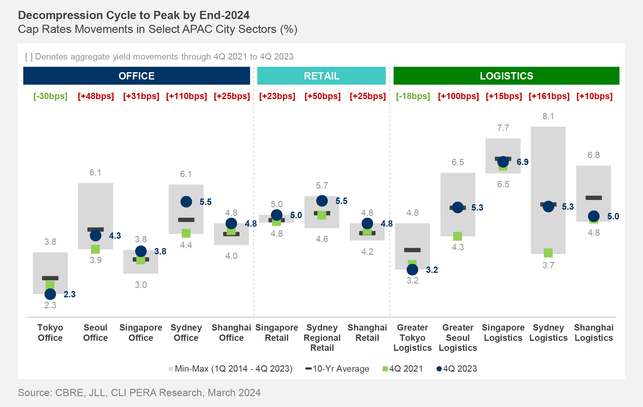 The APAC yield-decompression cycle commenced in early 2022 in tandem with the initiation of global rate hikes, and accelerated for most of 2023, with significant variances across markets (see figure below). The pronounced surge in interest rates has precipitated a substantial increase in borrowing costs and cap rates, driving bid-ask spreads to polarised ends. Consequently, this has notably dampened transaction activities across the region2.