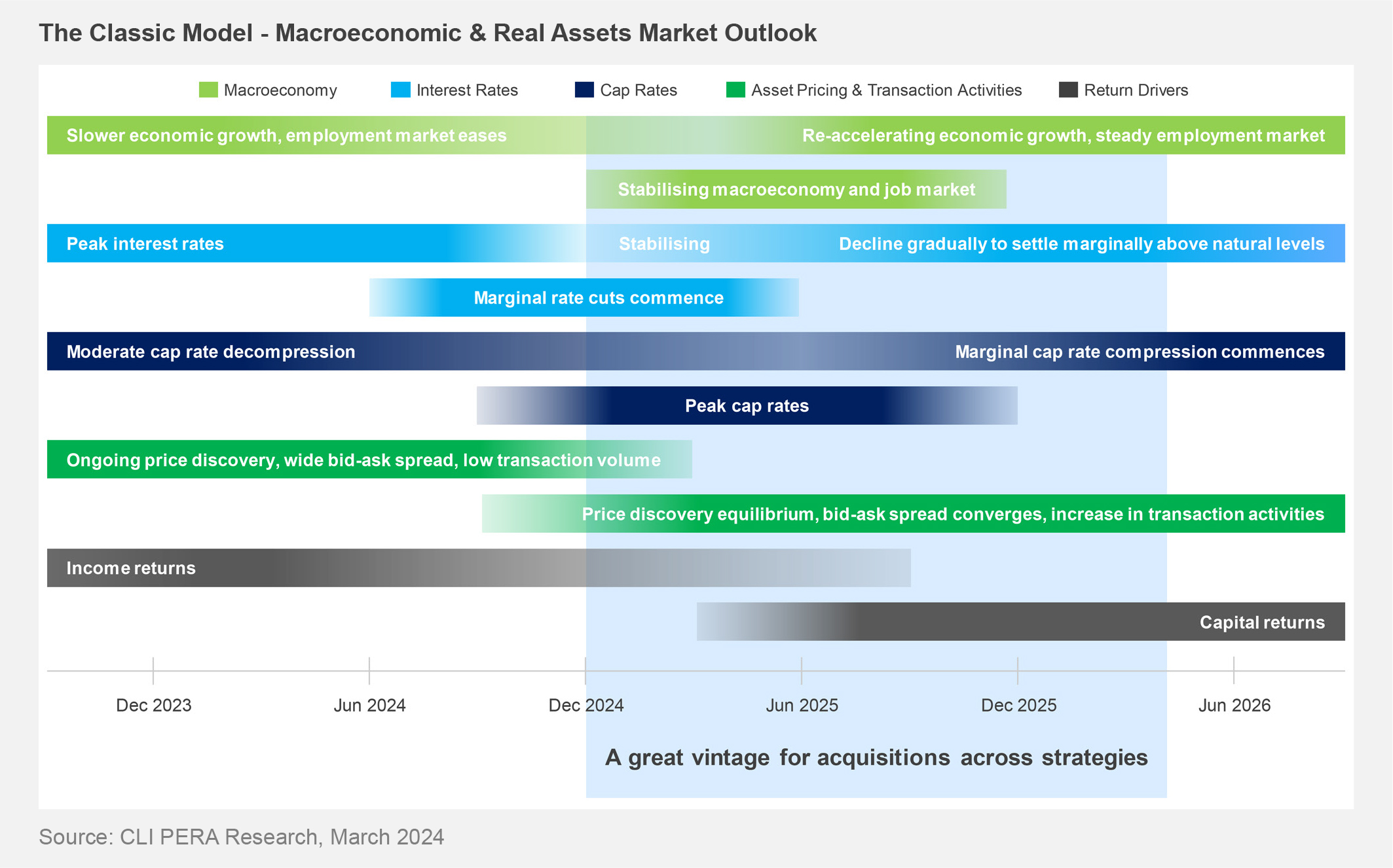 - Emerging Investment Prospects: The ongoing yield decompression and peak capitalisation (cap) rates in the real assets markets are expected to persist into 1H 2025. This phase, marked by repricing and accompanying refinancing pressures, is poised to unveil compelling options for discerning investors.