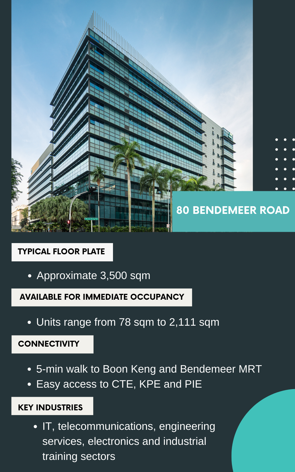 Four train stops away from Ubi lies another high-specification building at 80 Bendemeer Road, with compelling advantages for large and medium companies in manufacturing, light operations and clean industries. Conceived to provide businesses with fast and fuss-free move-in experiences, the units in this city-fringe development come ready with ceiling boards, light fittings and central air-conditioning. Spread over 10 floors, the workspaces feature generous floor plates, ensuring greater flexibility to optimise work configurations for higher productivity.