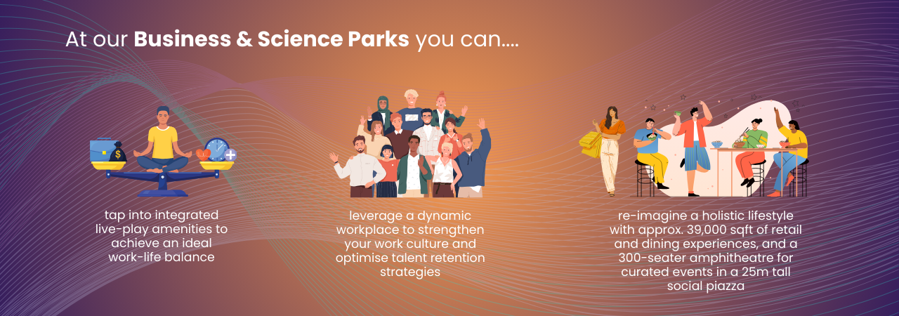 Meticulously crafted with lush landscapes and integrated with a vibrant diversity of retail and recreational amenities, our array of Science, Business & IT Parks are perfect for forward-thinking companies looking to operate in work-live-play environments to inspire their employees. Distributed across four parks, our 37 Science, Business & IT properties are broadband-enabled and equipped to serve the needs of the IT & ITES, bioinformatics, software development, telecommunications, electronics, and other hi-tech and R&D industries.