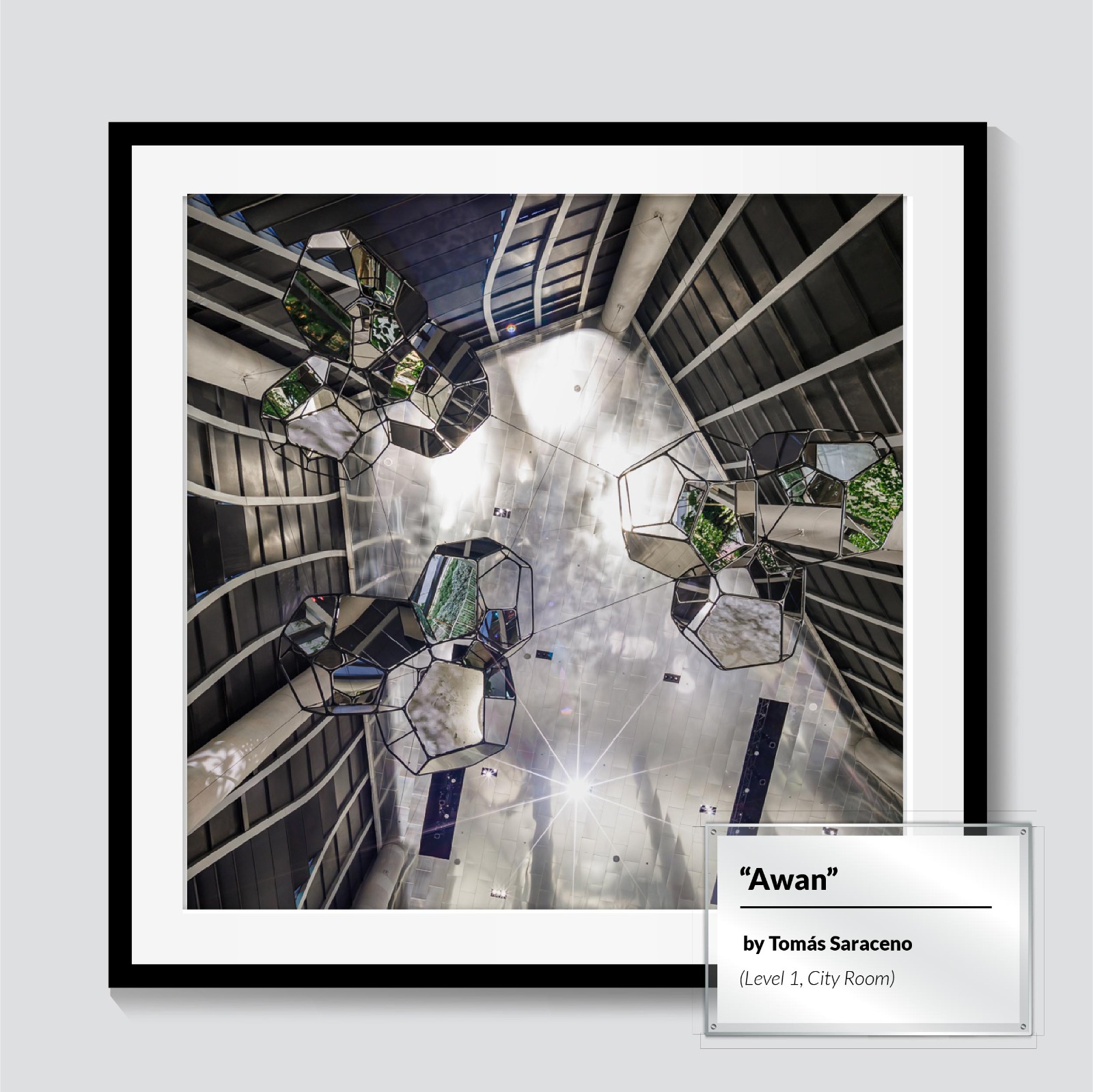 Just outside CapitaSpring’s doors is the City Room. Look up for a surprise! ‘Awan’ by Tomás Saraceno features a constellation of interconnected geometric mirrors coming together to form hanging structures that mirror daily life passing through CapitaSpring. Through the overlapping and multi-reflective connections made while experiencing the piece, visitors are invited to find a moment of respite and reflection. Whether you come by CapitaSpring in the day, or by night, take a moment to pause and reflect!