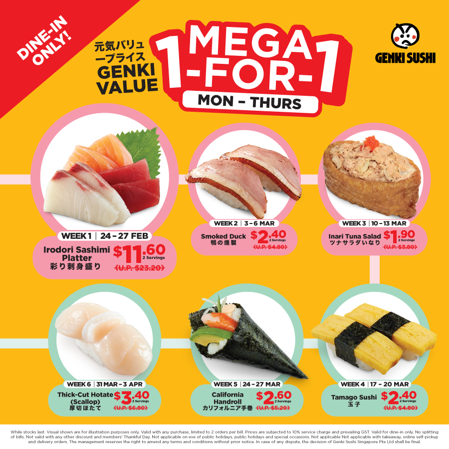MEGA 1-for-1 Weekly Deals! Double the delight with our MEGA1-for-1 deal weekly! Indulge in your favourites like Irodori Sashimi Platter, Tamago Sushi, Hotate Sushi, and many more without breaking the bank.