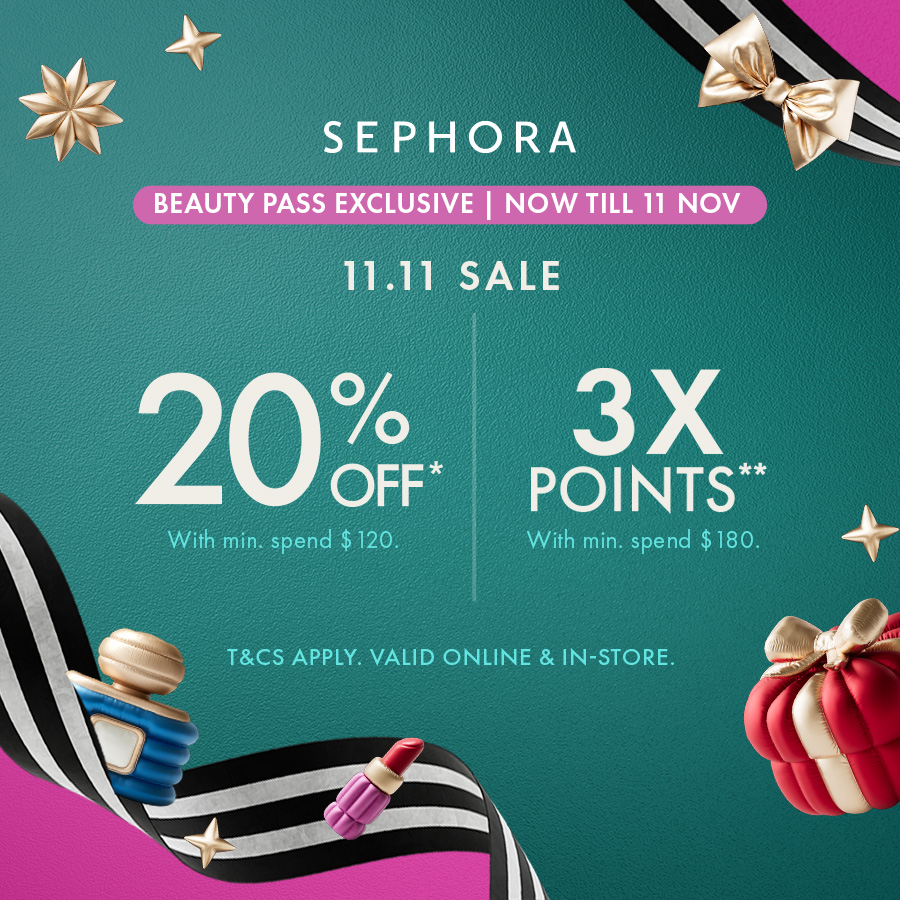Sephora Beauty Pass Member Exclusive: Offer is valid from 7 November 2024 (10:00pm SGT) to 11 November 2024 (11.59pm SGT) on sephora.sg, Sephora Singapore mobile app and at all Sephora Singapore stores (during store operating hours) from 7 November 2024 to 11 November 2024.