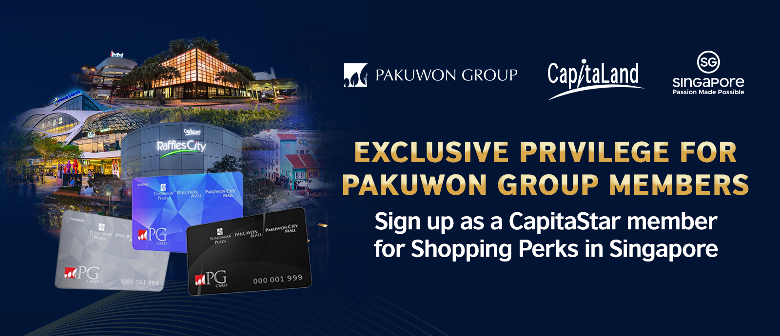Exclusively for Pakuwon Group members, receive bonus S$5 eCapitaVoucher in addition to the Tourist Welcome Gift of S$10 eCapitaVoucher when you sign up as a CapitaStar member and present your PG Card!
