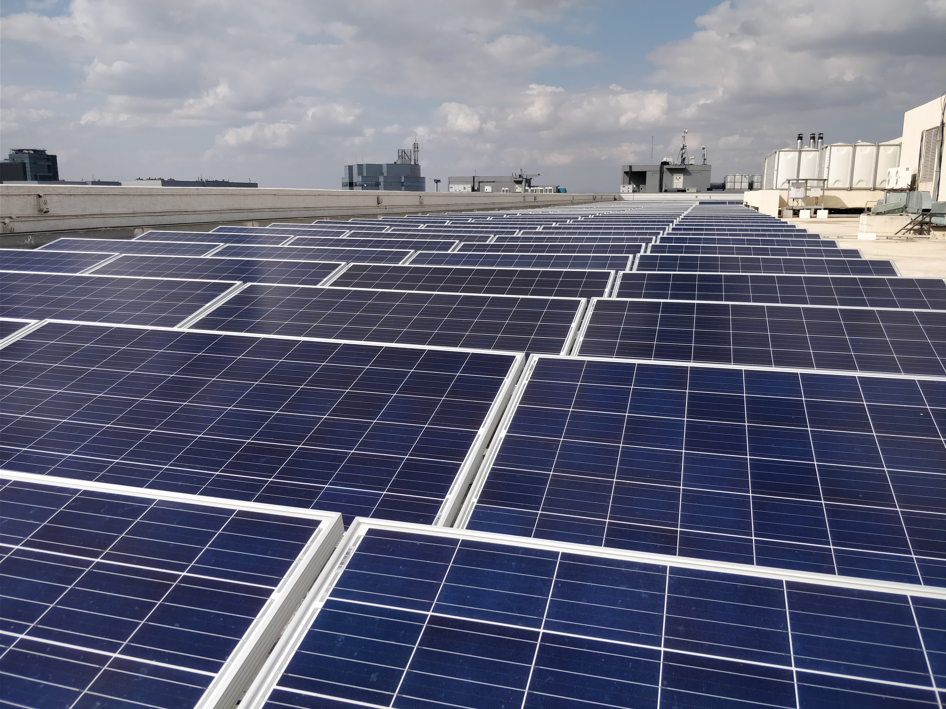 Các tấm pin mặt trời trên tầng thượng tòa nhà Aviator thuộc Khu công nghệ quốc tế Bangalore