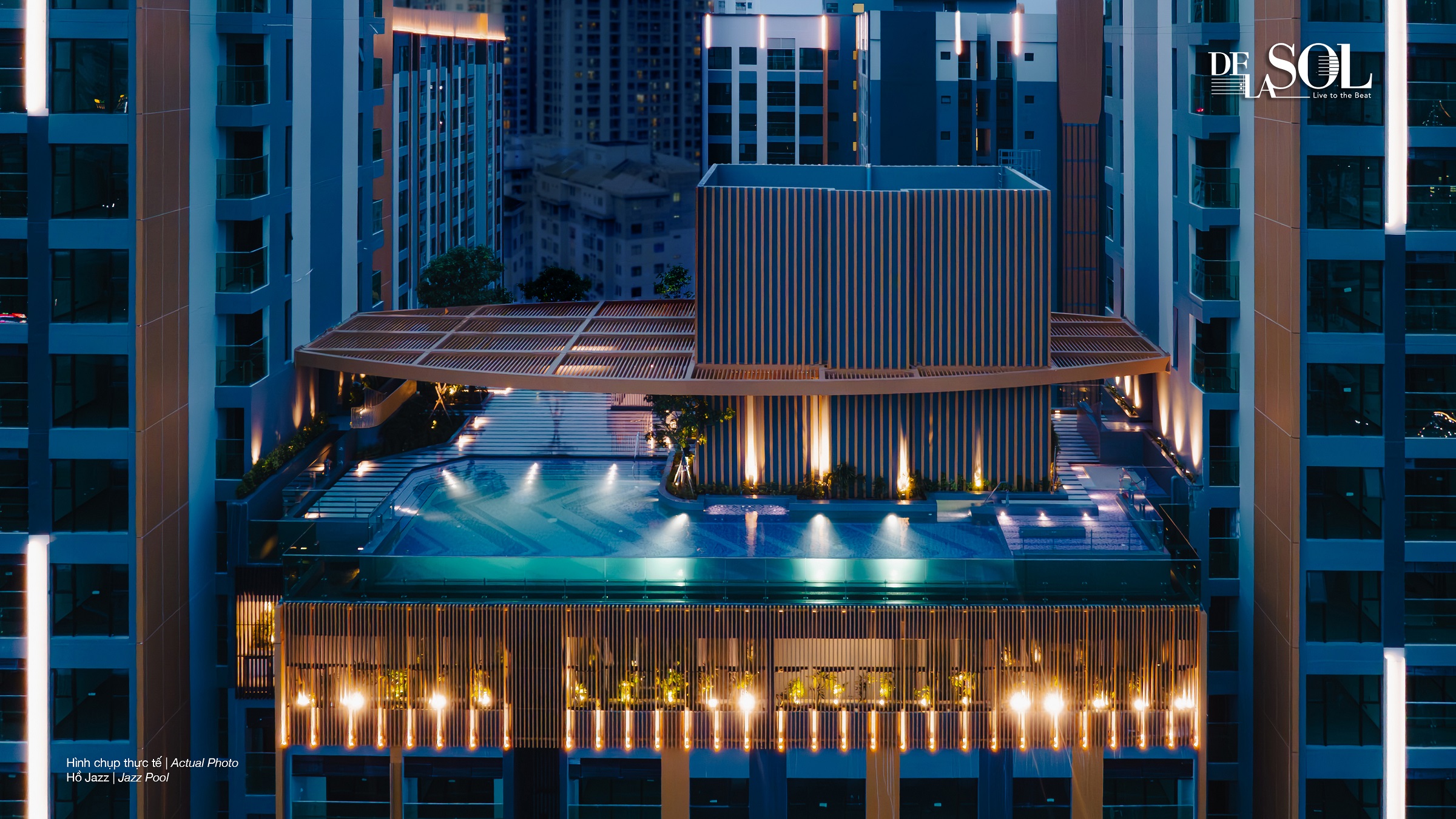 Chiêm ngưỡng Hồ Jazz trên tầng thượng của De La Sol. Hơn 50 tiện ích nội khu tích hợp tại De La Sol cũng thể hiện sự nhất quán, hòa hợp cùng phong cách kiến trúc, đáp ứng đời sống tinh thần cho cư dân